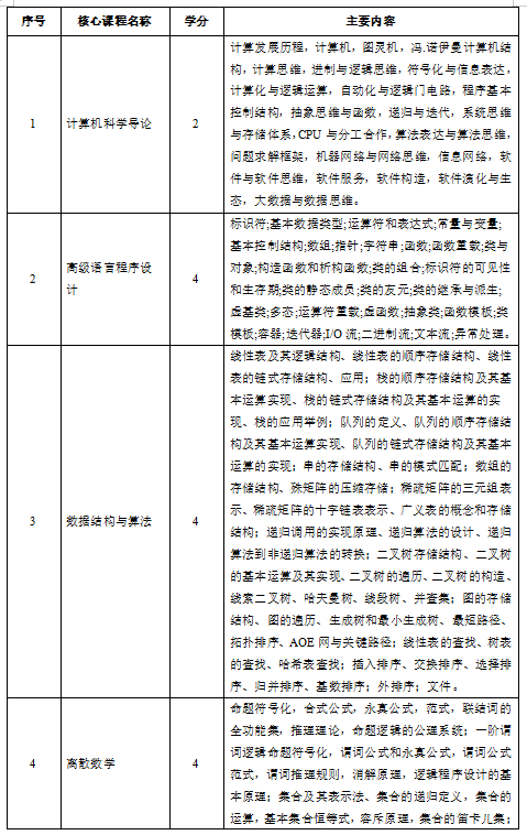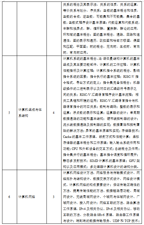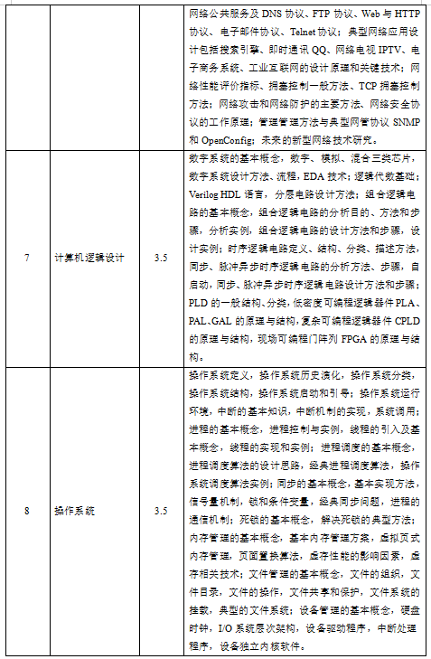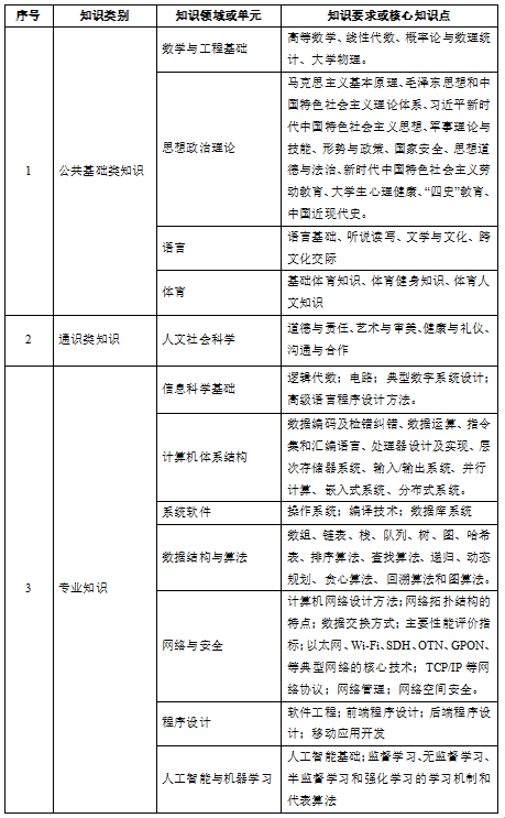 (3)专业知识:具有计算机科学数学基础、信息科学基础知识,了解学科的知识结构、典型技术、核心概念和基本工作流程。具有计算机体系结构、计算理论、软件工程、数据库系统、人工智能、信息安全等领域的专业知识,并在某一方面有所侧重。