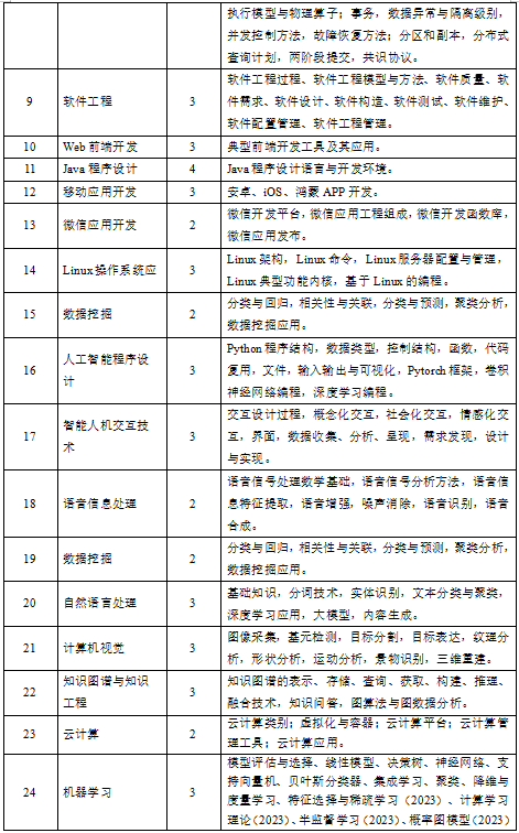 (3)专业知识:具有人工智能的数学基础、信息科学基础知识,了解学科的知识结构、典型技术、核心概念和基本工作流程。具有计算机体系结构、计算理论、软件工程、人工智能、数据库系统、信息安全等领域的专业知识,并在某一方面有所侧重。