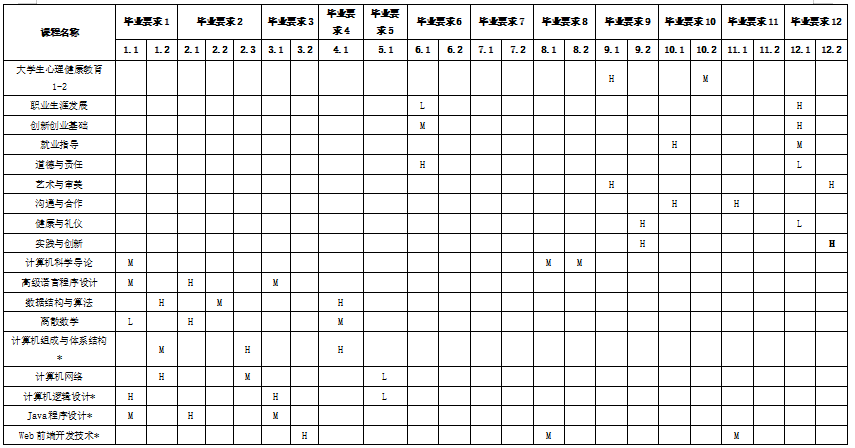 本专业课程及实践教学环节对毕业要求的支撑度(H、M、L)如下: