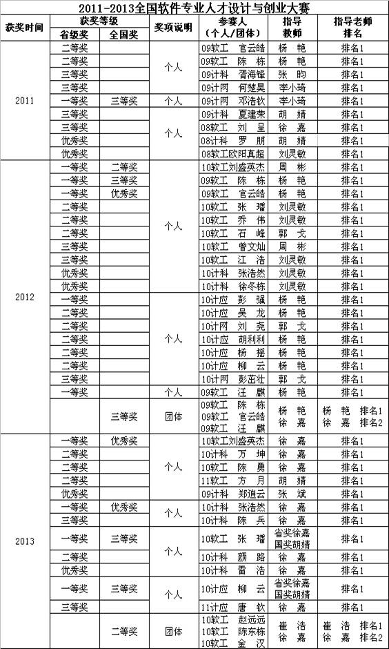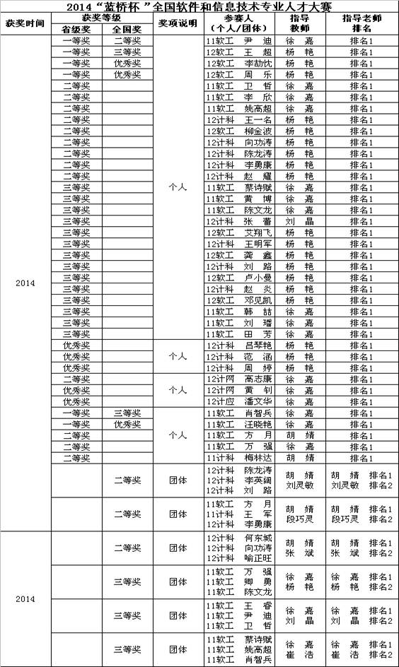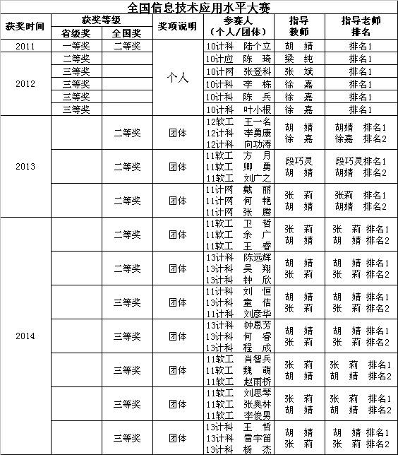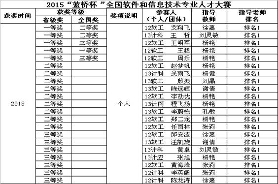 1.2015年“蓝桥杯”全国软件和信息技术专业人才大赛获得学校历届以来的最好成绩,荣获全国奖5项,其中:全国一等奖1项,全国二等奖2项,全国三等奖2项。全国软件类总决赛获奖等级位列全国1200多所参赛高校(含清华,北大)第48位,居湖北省所有参赛高校第2位,位列湖北省所有参赛的二本,三本院校第一位。