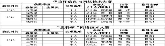 2.学科竞赛成果丰硕,近四年来,在“蓝桥杯”全国软件和信息技术专业人才大赛,全国信息技术应用水平大赛,全国高校物联网应用创新大赛, “挑战杯”全国大学生系列科技学术竞赛,省“挑战杯”大赛,“华为杯”网络技术大赛等学科竞赛中,学生荣获全国奖,省级奖合计204项,其中全国一,二,三等奖等76项;省一等奖,省二等奖128项;获优胜学校奖,组织奖3项;获指导学生大赛获奖教师186人次。