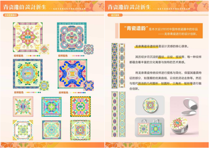 在本次大赛中,开云官方端网站登录入口的学子凭借扎实的专业知识和创新思维,在多个类别中崭露头角。在数媒静态设计类别的平面设计普通组,熊威、喻梓炫、叶绪硕等同学合作完成的《青瓷遗韵设计新生 —— 龙泉青瓷非遗纹样的跨界创新实践》荣获二等奖。该作品深度挖掘龙泉青瓷非遗纹样,将传统文化与现代设计相融合,运用计算机技术实现跨界创新,赋予古老文化元素全新的视觉呈现,为非遗文化在当代设计语境中的传承与发展提供了新思路。