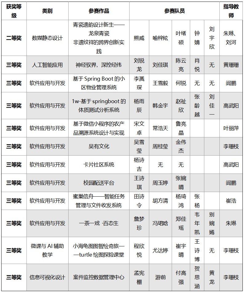在人工智能应用领域,刘锐龙团队的《神经驭界,深控经纬》项目斩获三等奖。他们聚焦智能控制与深度学习,通过项目实践展现了对前沿技术的理解与运用能力,探索人工智能在相关领域的创新应用,为解决实际问题提供了创新性方案。软件应用与开发类别更是成绩斐然,多个项目荣获三等奖。李溅琛团队开发的《基于 Spring Boot 的小区物业管理系统》,利用先进的技术框架,为小区物业管理打造便捷高效的信息化平台,提升管理效率与服务质量;杨雨辰团队的《1w - 基于 springboot 的体质测试分析系统》,通过计算机技术实现对体质测试数据的精准分析,助力健康管理与体育教学优化;此外,还有一些优秀的作品在众多参赛作品中脱颖而出,获奖名单如下: