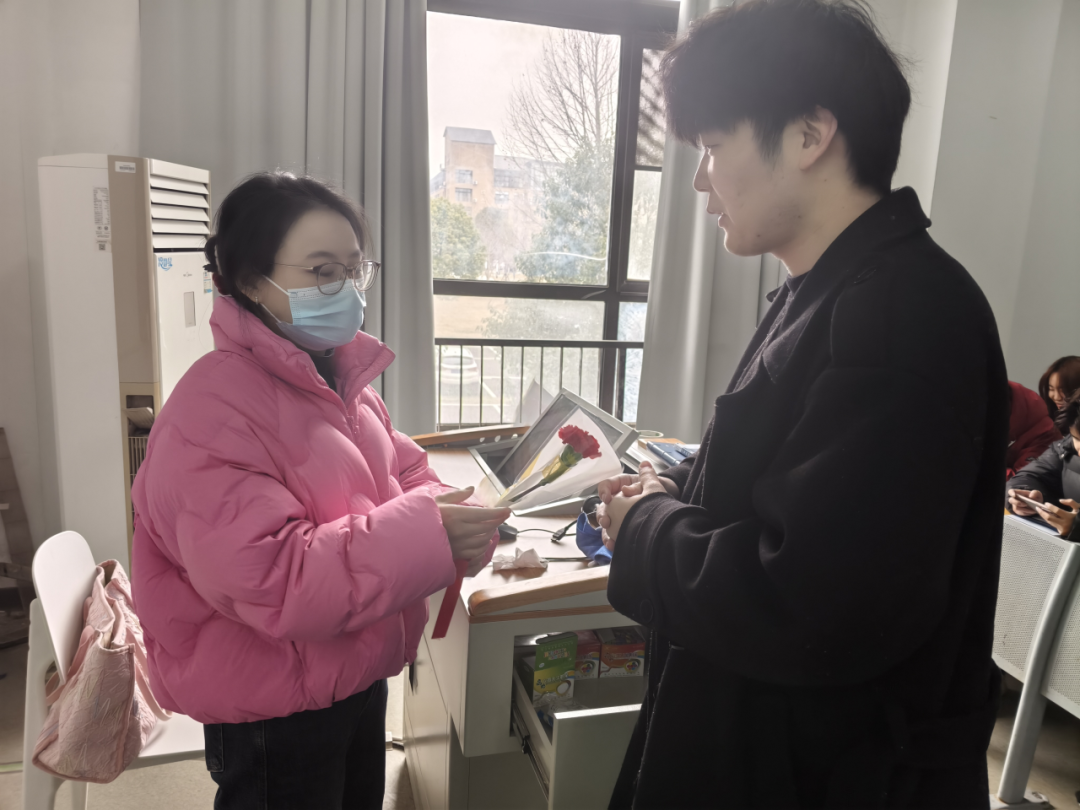 办公室里,平日里专注于教学科研、伏案批改作业的女教师们,此刻迎来了最暖心的“课间惊喜”。学子们手捧包装精美的花束,面带灿烂笑容,一声声“老师,妇女节快乐!”“您辛苦了!”,真挚而热烈,温暖了整个办公空间。