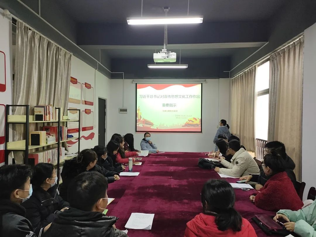 最后,党支部书记叶丽萍总结到,为落实习近平总书记重要指示精神,下一步,我们要根据工作实际继续引导广大学子厚植文化根基、增强文化自信、凝聚强大精神。首先是加强自身能力建设,持续用党的创新理论武装自己,坚定文化自信,在真学真懂真信真用、深化内化转化上下功夫;其次是主动占领宣传思想文化工作教育阵地,围绕学生思想政治工作的实际问题,充分利用网络新媒体进行正面宣传和引导;最后是打造精品项目,将宣传思想文化理论与实践工作循环互促融合,总结特色工作建设品牌项目,在育人同时提高教师的传播力、引导力、影响力和公信力,形成品牌效应。