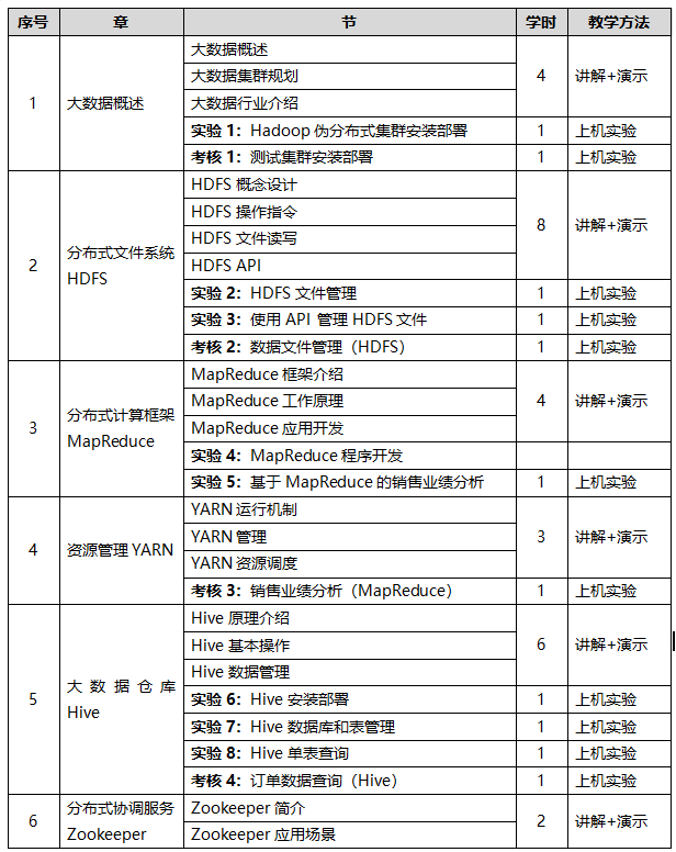本课程是大数据开发岗位对应课程之一,主要培养学生对大数据架构的理解、大数据平台的搭建与管理,以及常用大数据组件的管理及应用等大数据核心基础内容。具体内容包括大数据概述;Hadoop架构分析;核心组件原理及应用;数据仓库Hive原理及应用;协调服务Zookeeper应用场景介绍;Hadoop集群运维等。