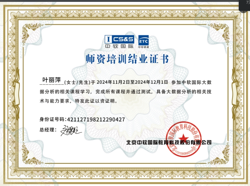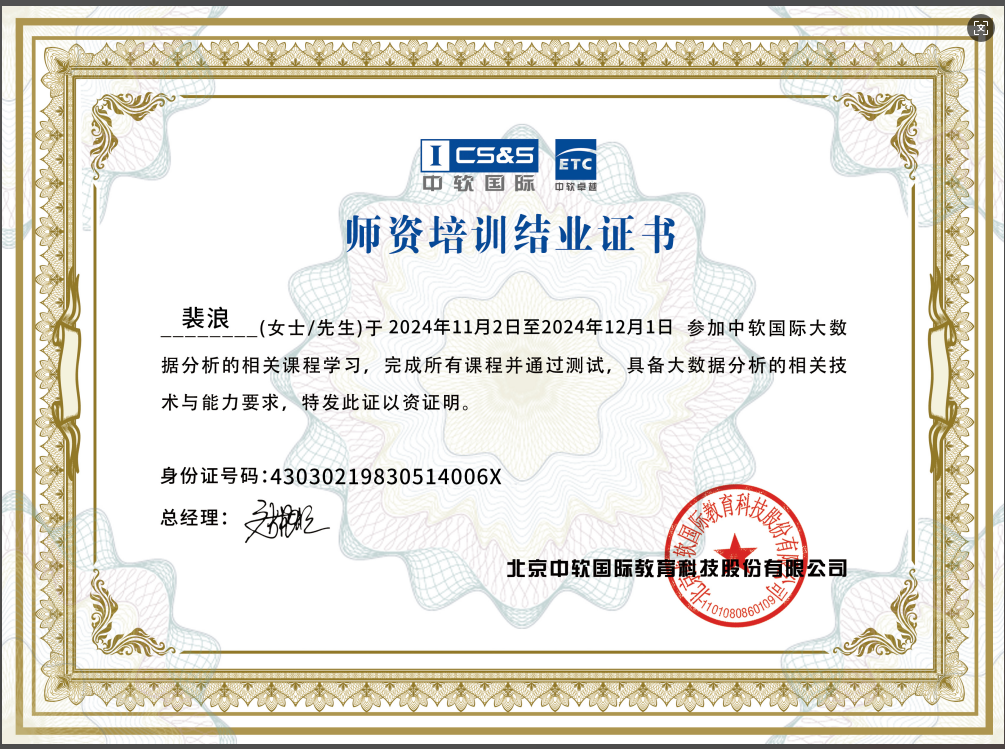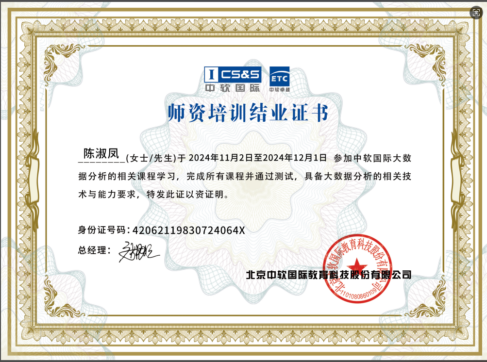 十天实训后,参训教师均通过中软国际“企业级数据分析师”认证考核。